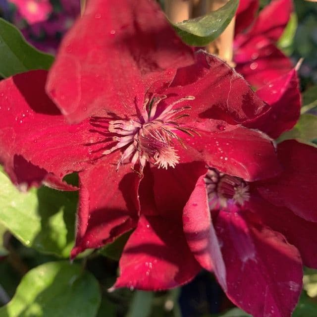 Deciduous clematis with maroon flowers in late summer which have light purple centres from May to September These are young plants which can be planted if care and attention is given to watering and shading. Clematis need a cool root run which can be improved with a neutral pH mulch, and shading with surrounding plants, or with stones/slates. Clematis do not like to dry out completely and a weak liquid feed will be beneficial to encourage new growth.