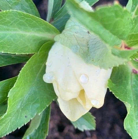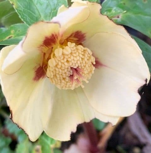 Single white-gold with red/maroon basal blotch. Upward facing blooms. A fairly recent introduction to the hellebore range. Ht 60cms. Flowering February to April. Hardy and easy. Pale leaves.