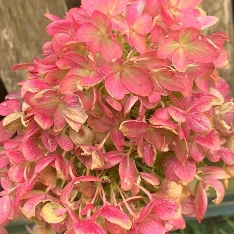 Lime greeny/white flower heads on this shrubby hydrangea. 'Little Lime is a more compact plant than 'Limelight' with smaller leaves and smaller flower heads, but equally impressive when in flower. As the flowers fade, or change, for the autumn the colours turn pink as shown in the photo. Hardy & Easy.