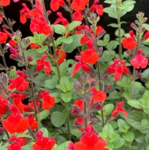 Postbox red flowers on this Salvia. Nice variety which is a deciduous shrublet which continuously flowers from spring right through to frosts. Well drained soil essential as Salvias dislike wet feet. Can grow to 3ft x 3ft and best pruned after all frosts have passed to keep this plant bushy. Best in a sheltered position amongst other shrubs and perennials.