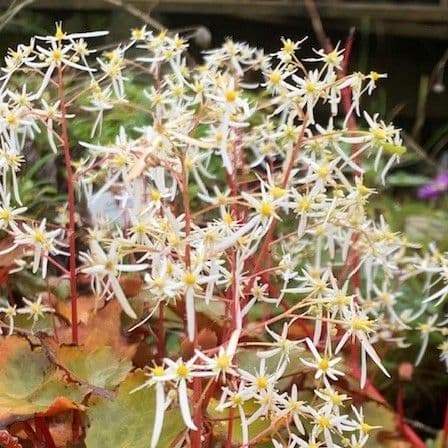 Lovely perennial plant. Saxifraga family and flowering in October/November. Ht approx 15cm when in flower. Hardy and easy. Lobed leaves are flushed with bronze. Clump forming perennial.